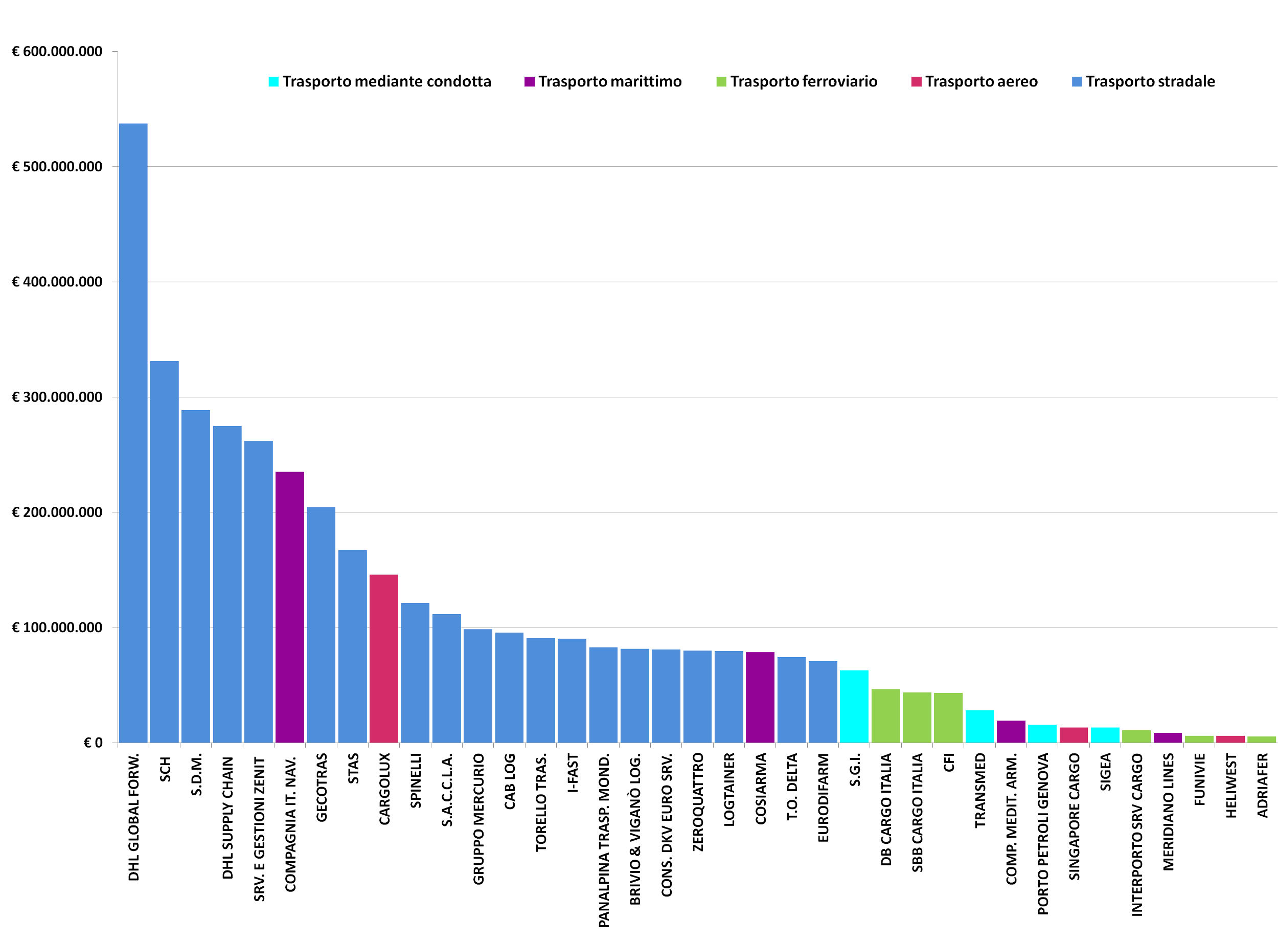 Tra le aziende di trasporto di merci su strada e servizi di trasloco, si posiziona al primo posto la Dhl Global Forwarding (Italy) s.p.a. di Rozzano (Milano) pur registrando una perdita di 35.464.628 €; seguita dalla Sch s.r.l. di Fidenza (Prato) che anche perde 6.314.599 €. Al terzo posto, la S.D.M. s.r.l. (Società Distributrice Merci) di Bergamo con un fatturato di 288.694.104 €; al quarto, la Dhl Supply Chain (Italy) s.p.a. di Settala (Milano) con 275.055.738 € che supera di poco la Servizi E Gestioni Zenit s.r.l. di Modica (Ragusa) il cui fatturato ammonta a 262.019.686 €.