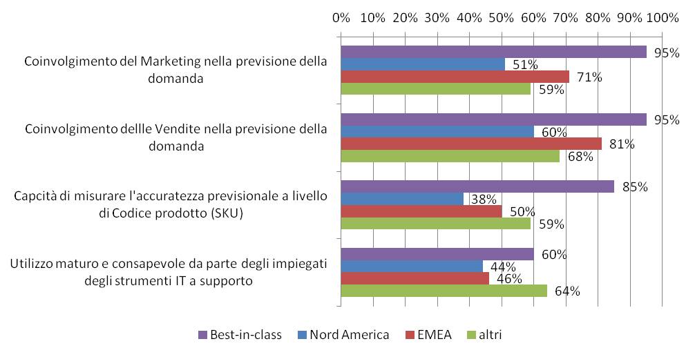 Anche dal punto di vista più squisitamente organizzativo, le aziende nordamericane sembrano pagare pegno rispetto alle altre: per una volta, a fare la parte del leone sono le aziende europee, le quali - essendo fortemente focalizzate su processi formali di pianificazione della domanda - risultano essere particolarmente valide nel tenere in considerazione ad esempio il parere ed il contributo di vendite e marketing nella previsione della domanda.