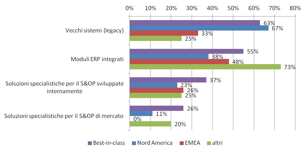 Le aziende nordamericane sono molto più delle altre inclini a utilizzare sistemi informatici di vecchia generazione: questo si spiega facilmente, pensando al semplice fatto che negli USA hanno iniziato ben prima degli altri ad utilizzare l`informatica a supporto della pianificazione e all`esecuzione dei processi di Supply Chain. Per forza di cose, invece, i paesi emergenti si stanno dotando di nuove tecnologie, ossia quelle disponibili al momento dell`implementazione.